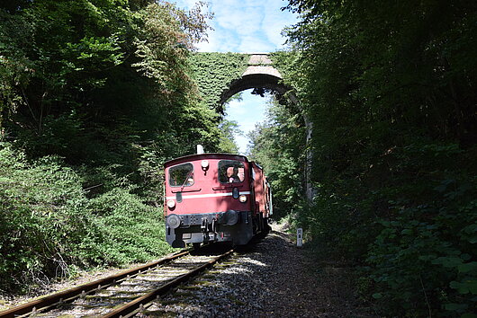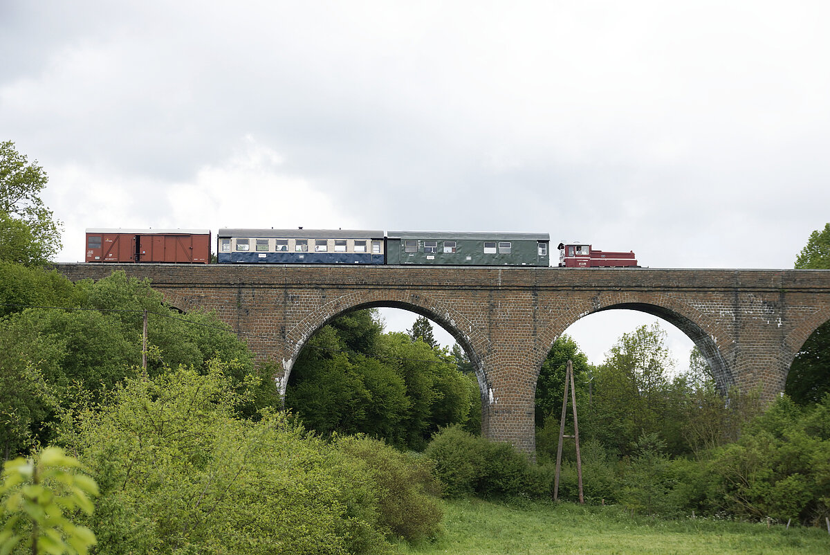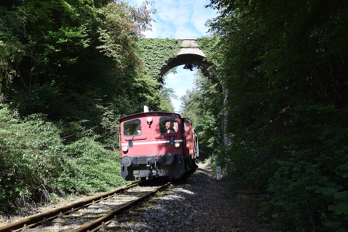 Der Haltepunkt Marth liegt noch in der Steigung und unsere Lokomotiven müssen sich gewaltig ins Zeug legen, um den Zug in der Rampe wieder in Bewegung zu setzen. In einem weiten Bogen führt die Bahnstrecke anschließend durch einen tiefen Einschnitt, der beim Bahnbau in die Ausläufer des Kehrberges gegraben werden musste. Über den Einschnitt führt eine 45 m lange und 50 m hohe dreibogige Steinbrücke.