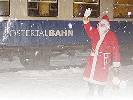 Auch dieses Jahr fahren wir wieder drei mal mit unseren traditionellen Sonderzügen durchs Ostertal zum Nikolaus. Die erste Fahrt führt am 1. Advent zum mittelalterlichen Weihnachtsmarkt auf Burg Lichtenberg. Die beiden Fahrten am 2. Adventswochenende starten am späteren Nachmittag als Fackelfahrten, wobei der Weg des Nikolaus zum Zug mit Fackeln ausgeleuchtet wird.